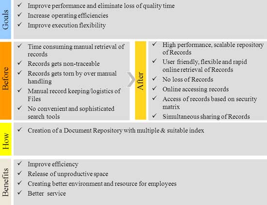 Once your documents are digitized in electronic form still your employees cannot easily locate the information they need when they need it. In most companies, documents are stored in a variety of places - on networks, on individual PC hard drives, CDs, and zip drives, in file cabinets and in desk drawers.The answer to reduce this complexity is a document management system.Documents and images are held in a single repository that simplifies managing and retrieving the files when necessary.